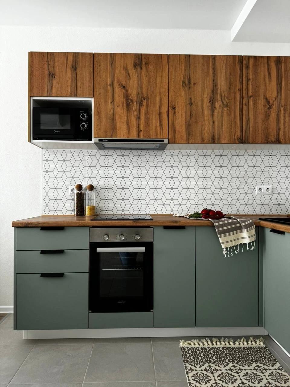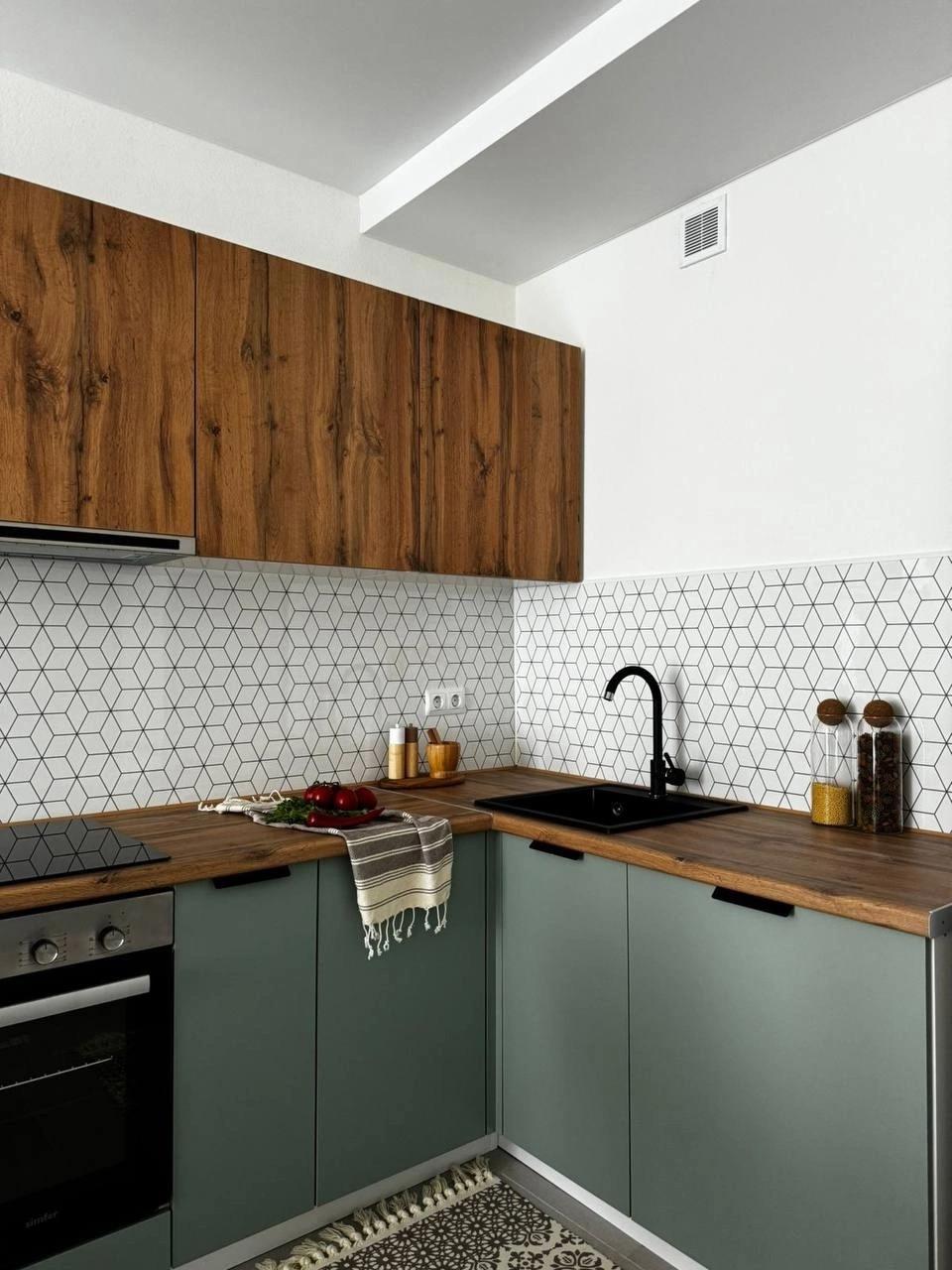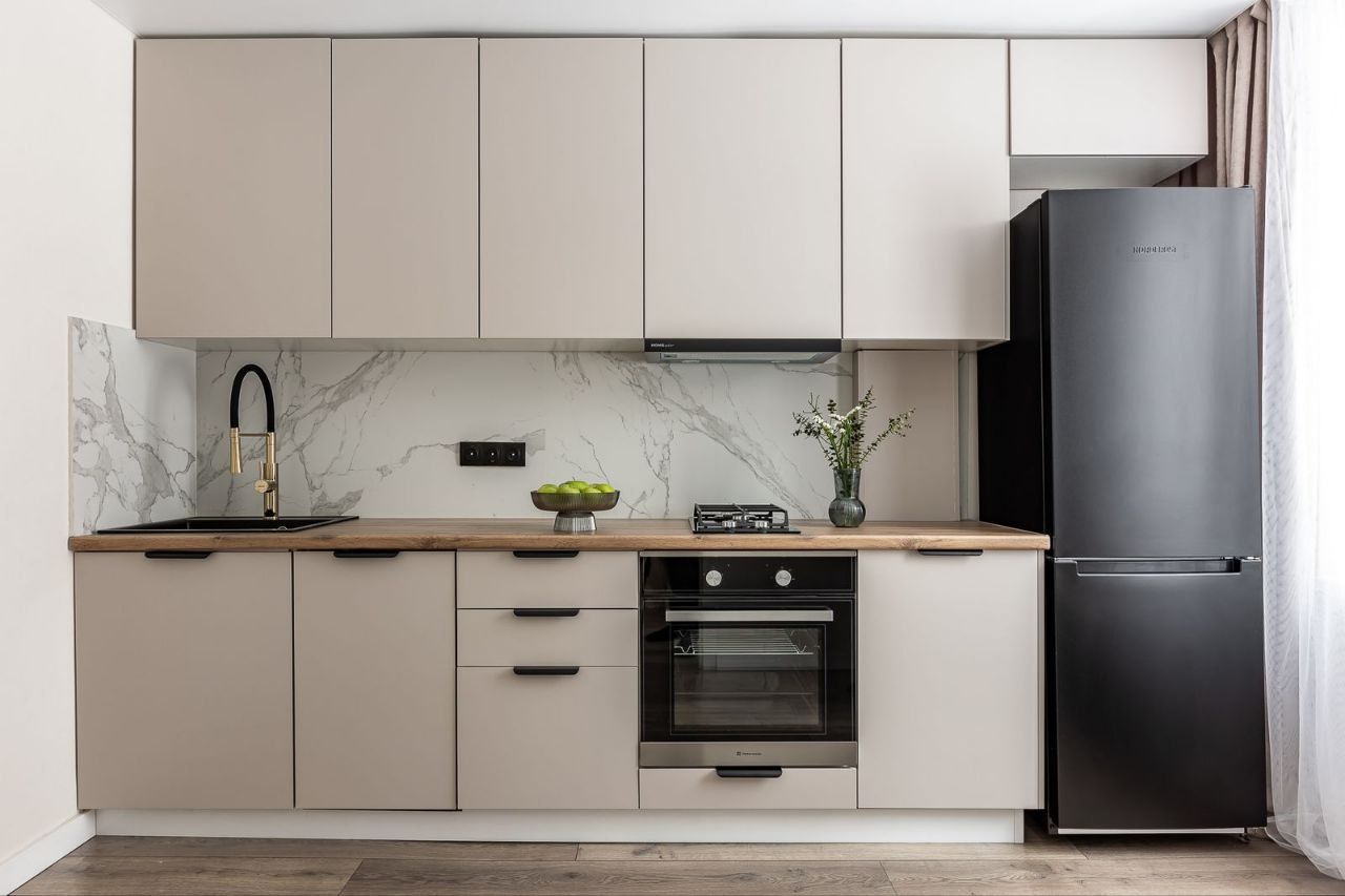 Эта кухня качественная и геометрически простая. Поможет вам грамотно организовать пространство в едином индустриальном стиле. Декоры фасадов Wotan Oak и Temple Stone — это беспроигрышный вариант сочетания материалов, который останется востребованным еще много лет