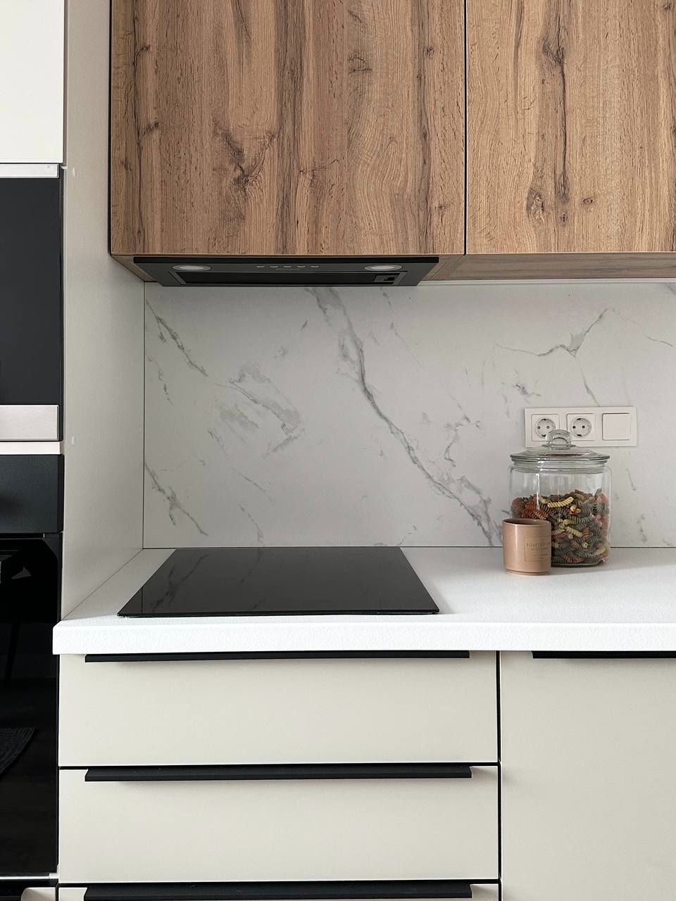 Фасады МДФ с кромкой ПВХ выглядят аккуратно. Создается эффект того, что каждый элемент гарнитура выделяется едва заметными контурами, что добавляет кухне шарм. К каждому шкафчику и ящику приятно притрагиваться, благодаря специальному высокоглянцевому акриловому покрытию Acrylit (Акрилит).