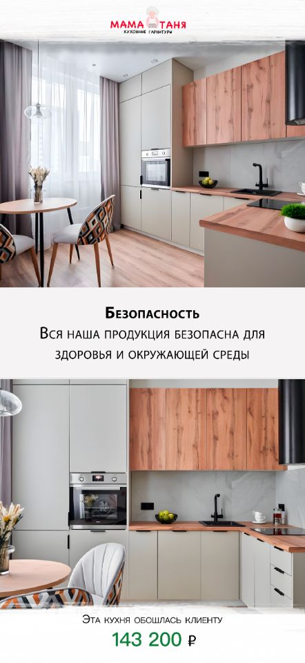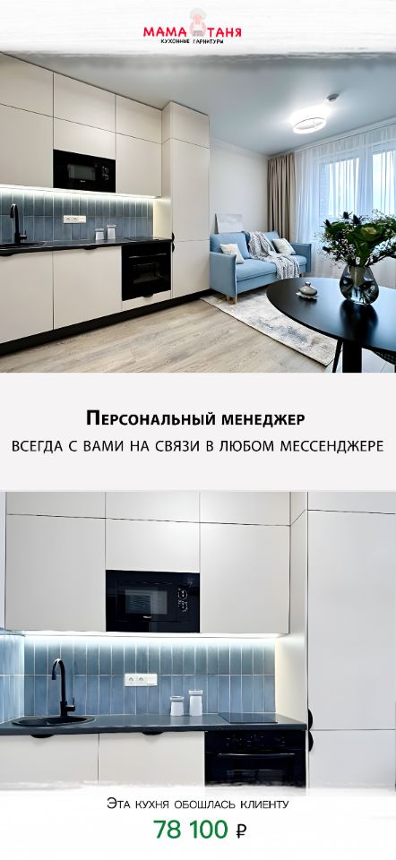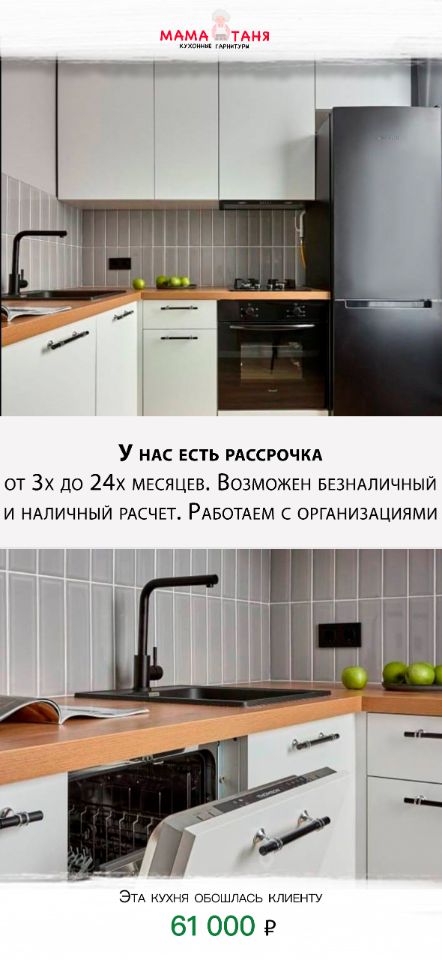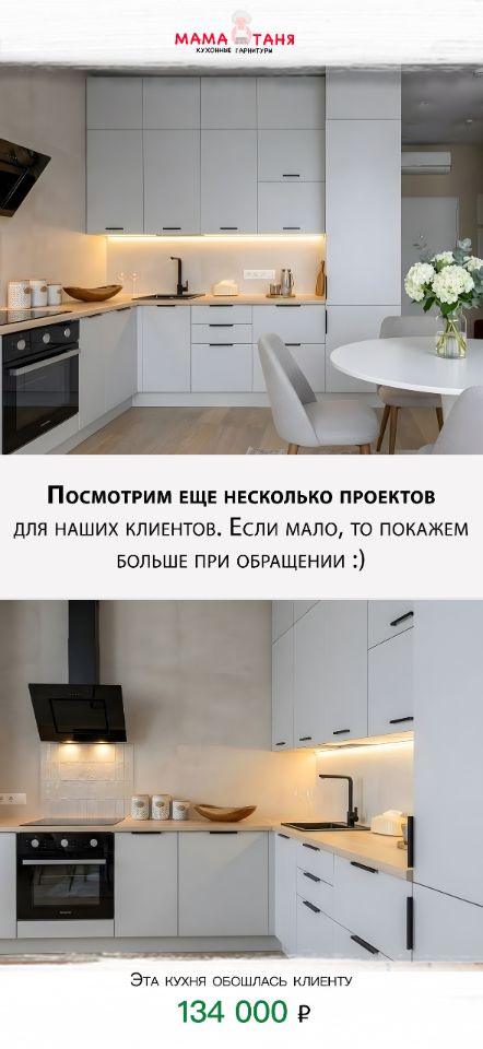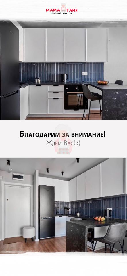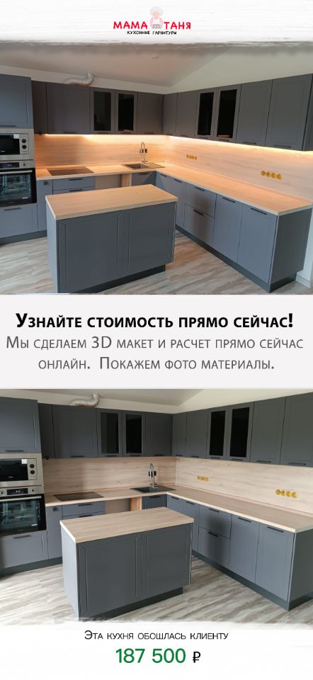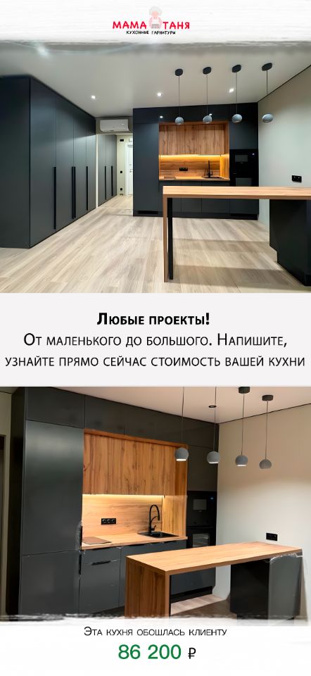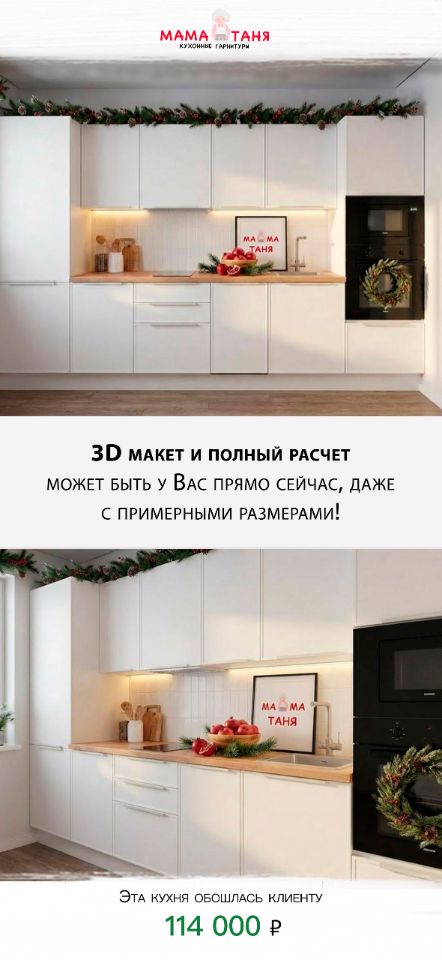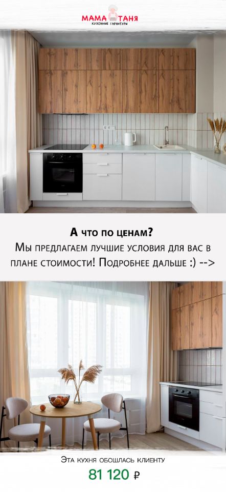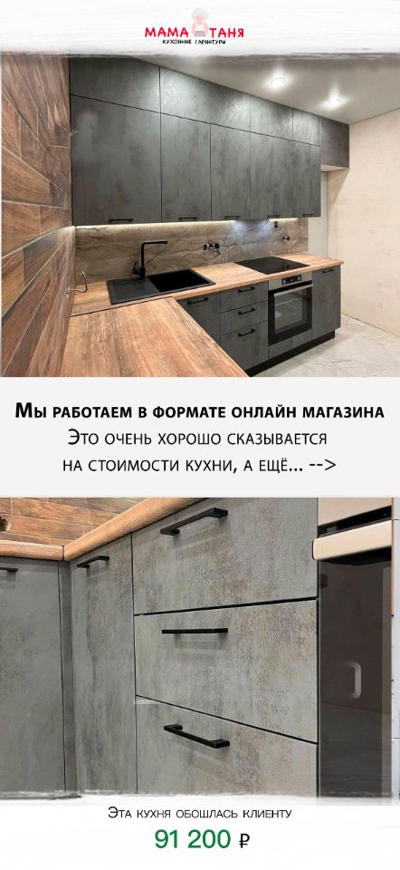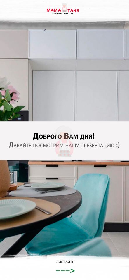 Предлагаем к просмотру небольшую презентацию нашей компании Мама Таня, расскажем о наших возможностях и плюсах, а так же вы сразу посмотрите готовые проекты с ценами для наших клиентов, что бы приценится к кухонькам!